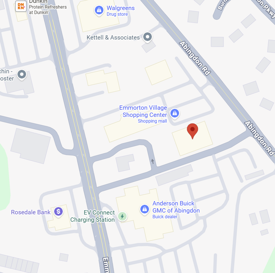 From 95: Take 924 N to just past the Buick dealership and dispensary. We are the next plaza, Emmorton Village. We are the SECOND single story building on the right, in the lower part of the parking lot (past Fortunato’s).